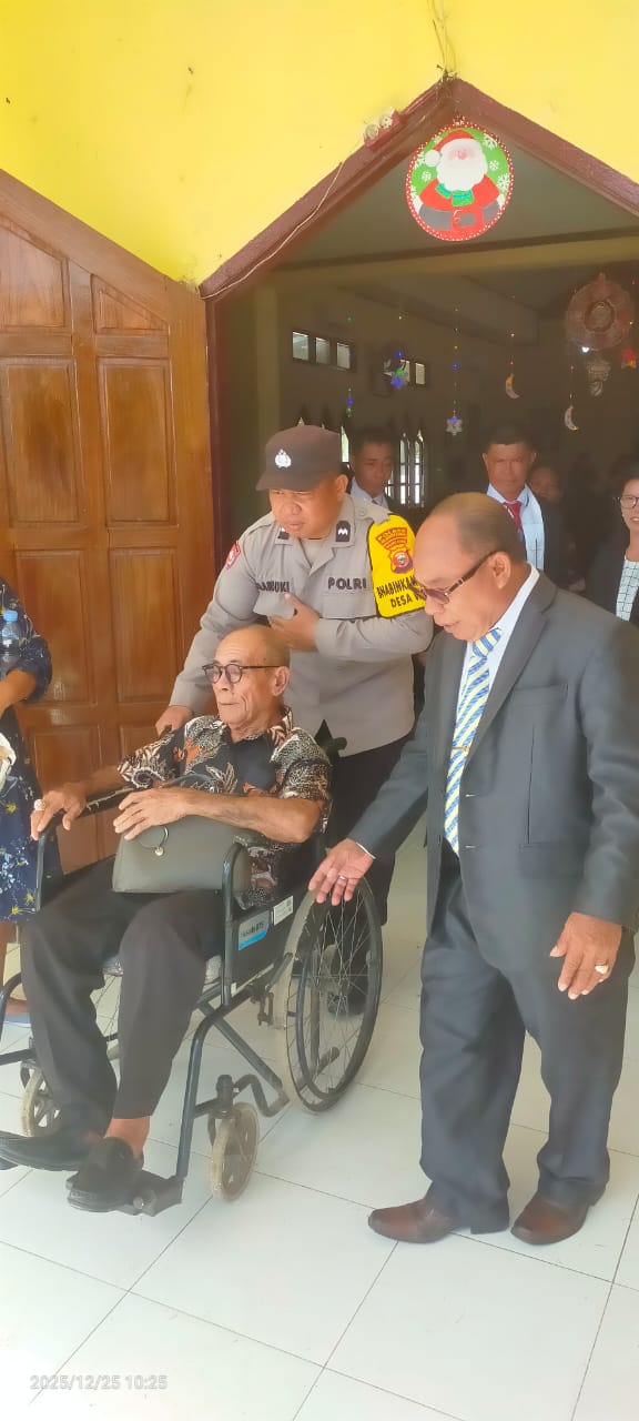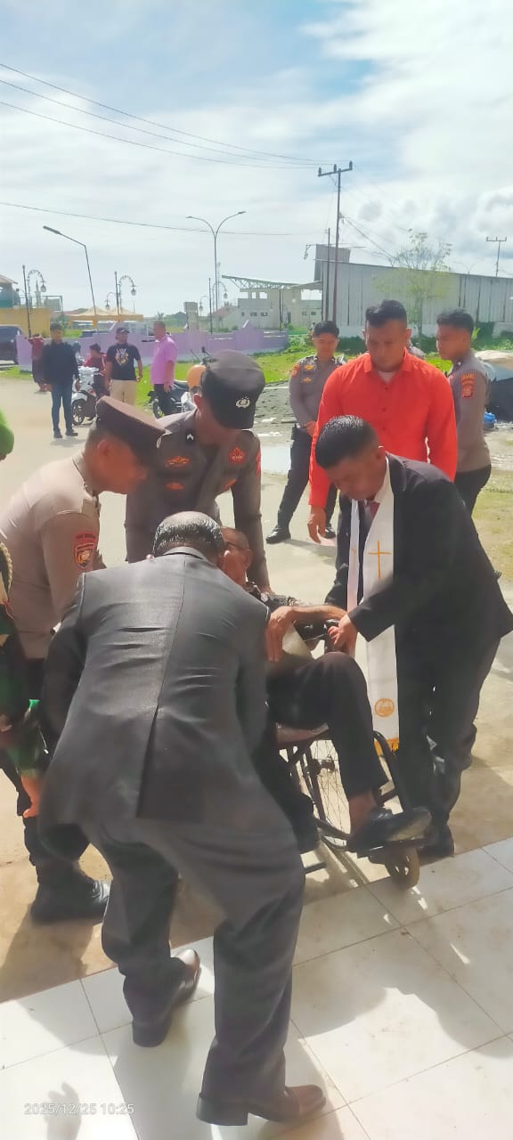 Halmahera Tengah – Anggota Polres Halmahera Tengah yang bertugas melakukan pengamanan (PAM) di Gereja Maranata menunjukkan aksi humanis saat pelaksanaan ibadah, Kamis 25 desember 2025.