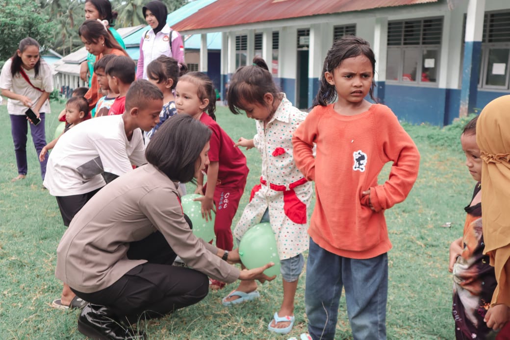 Dalam kegiatan ini, Polwan Polres Ternate tidak hanya memberikan bantuan kebutuhan pokok, tetapi juga menyelenggarakan sesi trauma healing bagi anak-anak dan warga setempat.