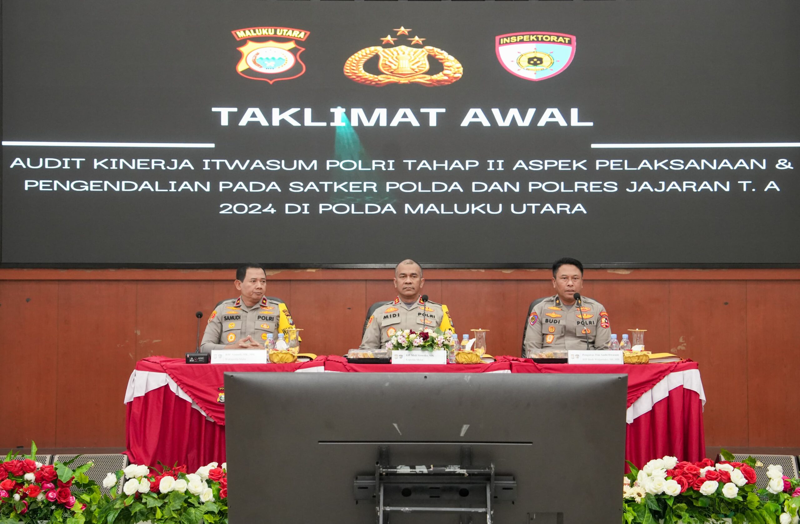 Hadir dalam acara tersebut Wakapolda Malut, Brigjen Pol. Samudi, S.I.K., M.H, Ketua Tim Audit Kinerja Irwasum Polri, Brigjen Pol. Budi Widjarnako, S.H., M.H., beserta anggota tim, pejabat utama Polda, serta para Kapolres/Ta jajaran.