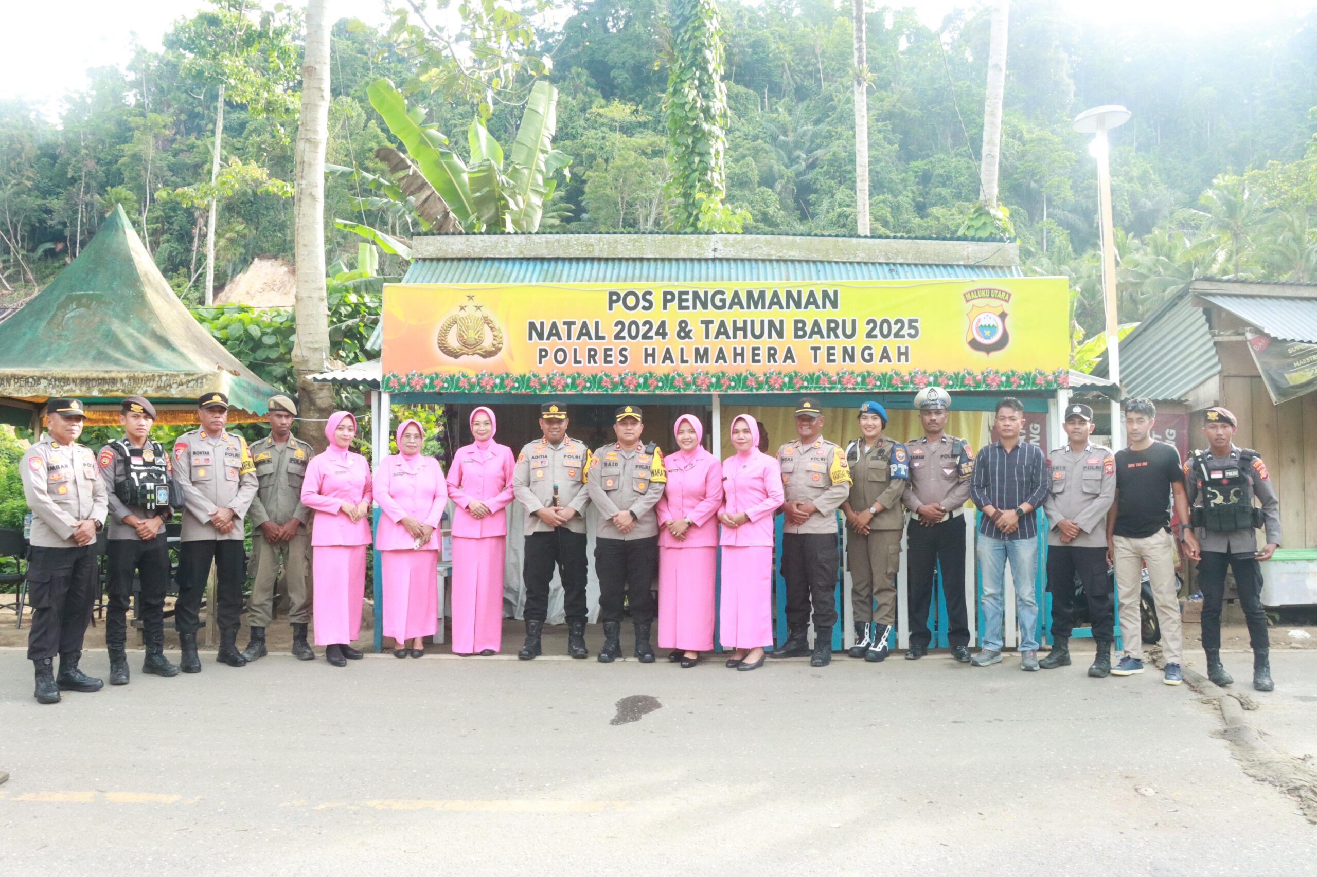 Weda – Kapolres Halmahera Tengah AKBP Aditya Kurniawan.,S.H.,S.I.K bersama Ketua Bhayangkari Cabang Halteng Ny. Tena Aditya melaksanakan kunjungan ke sejumlah Pos Pengamanan (Pos Pam) Operasi Lilin Kie Raha 2024 Senin (30/12/24)