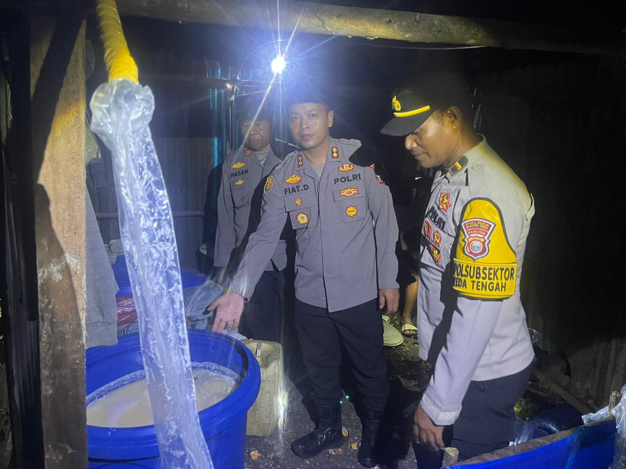 HALMAHERA TENGAH — Kapolres Halmahera Tengah AKBP Fiat Dedawanto, S.Pd.T., S.I.K., M.H. memimpin langsung penggerebekan dugaan tempat penyulingan minuman keras (miras) oplosan/fermentasi di Desa Kobe, Kecamatan Weda Tengah, Kabupaten Halmahera Tengah, Selasa (10/2/2026) malam.