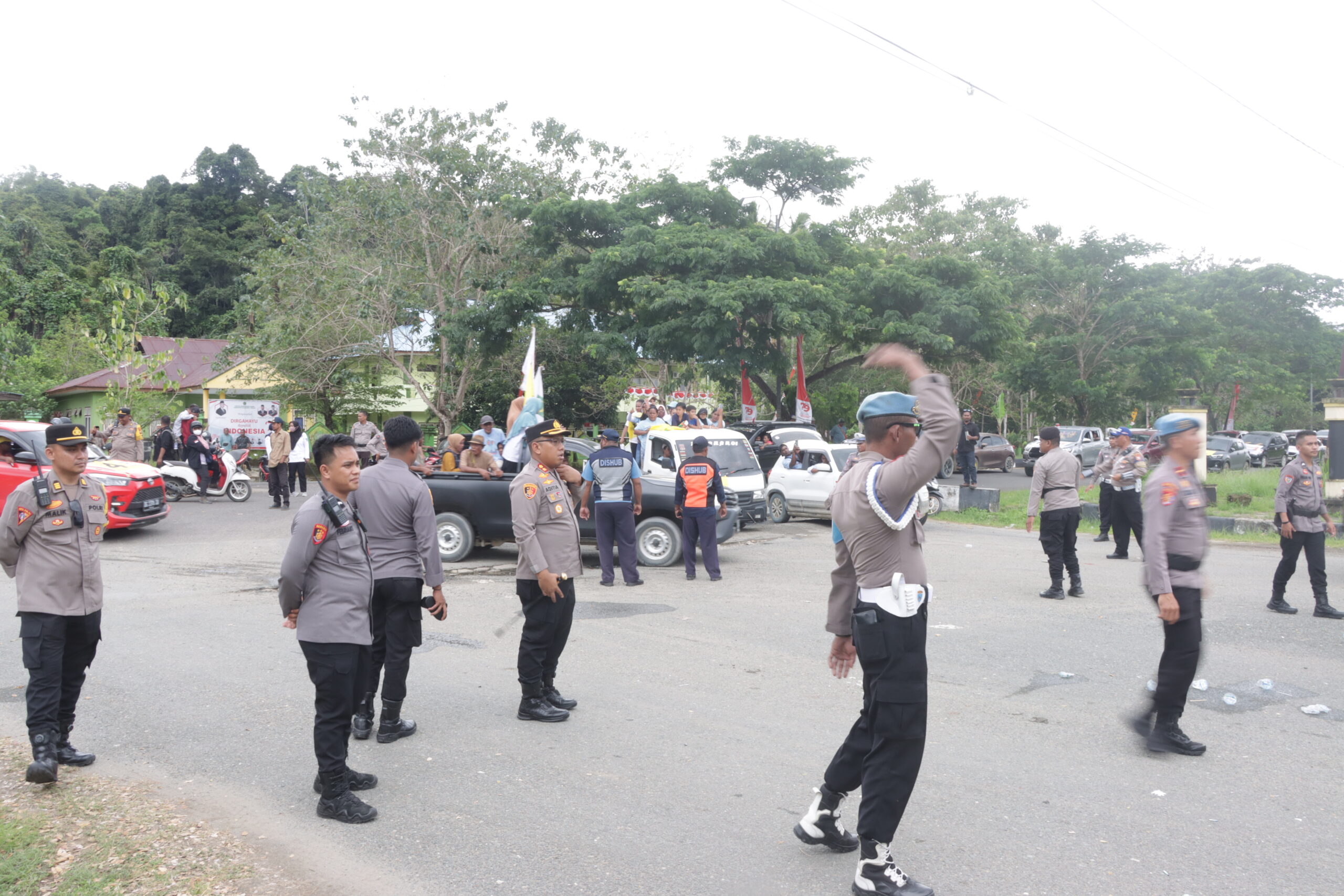 Weda – Hari kedua tahapan pendaftaran Calon Bupati dan Calon Wakil Bupati Halmahera Tengah 2024, Polres Halmahera Tengah melaksanakan pengamanan pendaftaran dan Deklarasi pasangan bakal Calon Bupati dan Wakil Bupati Halteng di Kantor KPU kabupaten Halteng Kamis (29/8/24).