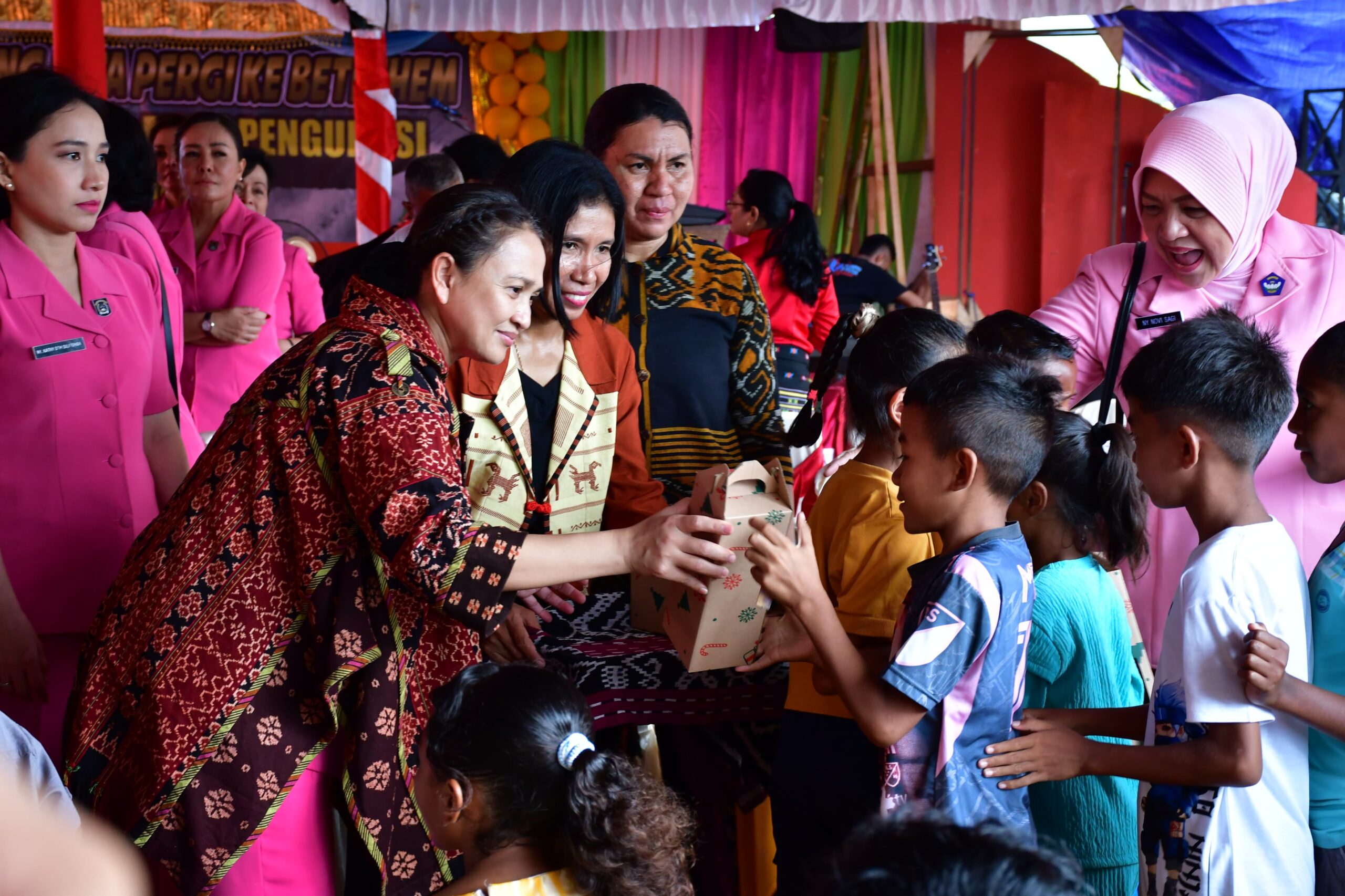Flores Timur NTT. Ketua Umum Bhayangkari Pusat, Juliati Sigit Prabowo, merayakan Natal bersama para korban erupsi Gunung Lewotobi di Desa Kobasoma, Kecamatan Titehena, Kabupaten Flores Timur, Nusa Tenggara Timur (NTT), Sabtu (28/12/2024).