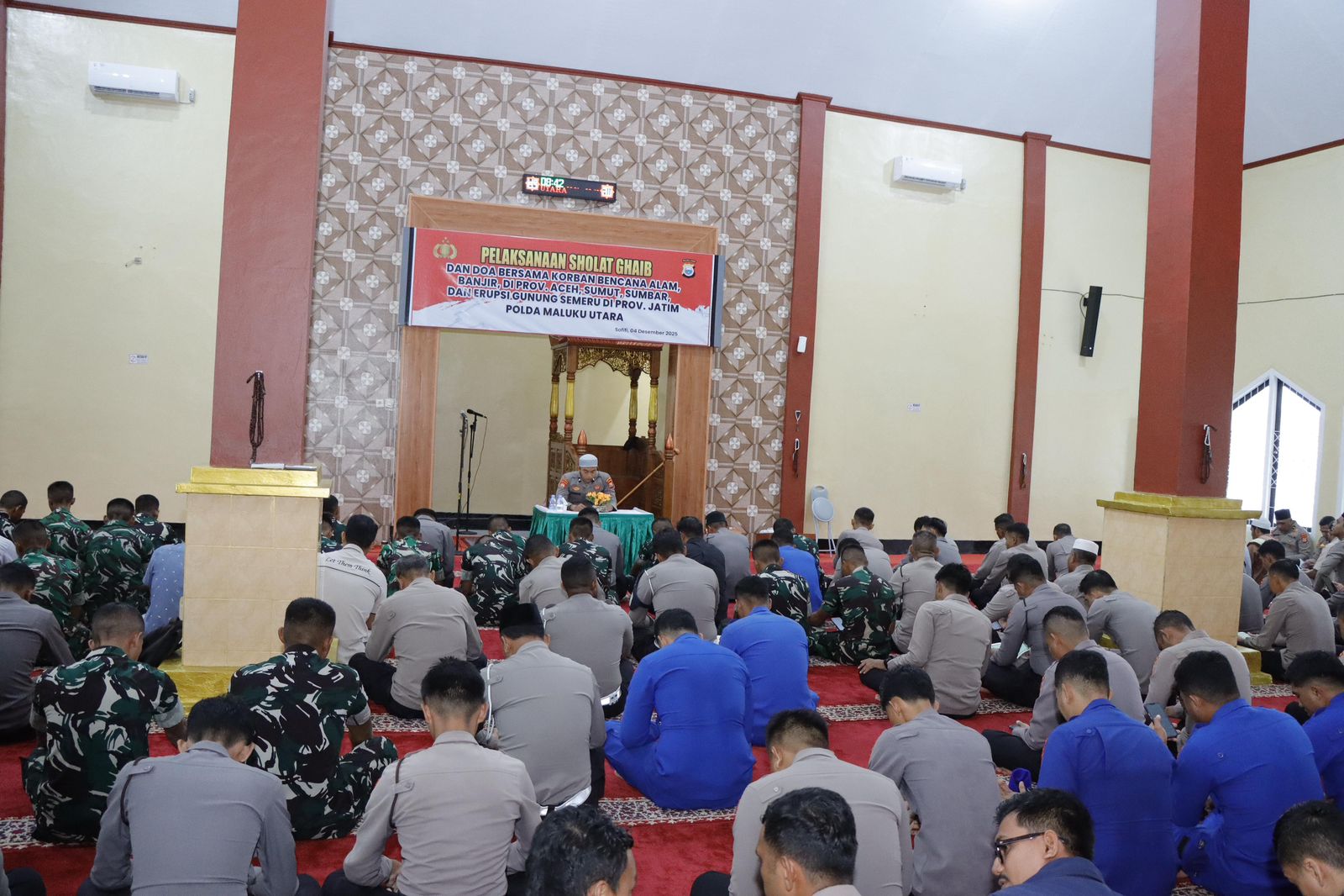 Kepolisian Daerah Maluku Utara menggelar kegiatan Sholat Gaib dan Doa Bersama sebagai bentuk empati dan solidaritas kemanusiaan terhadap para korban bencana alam banjir di Provinsi Aceh, Sumatera Utara, dan Sumatera Barat, serta erupsi Gunung Semeru di Provinsi Jawa Timur, Kamis (4/12).