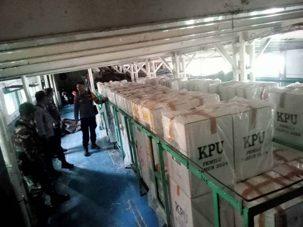 Kapolres Halmahera Tengah, AKBP Faidil Zikri S.H., S.I.K, melalui Kasihumas Ipda Ramli Soleman, menjelaskan bahwa sebanyak 85 Kotak Suara dan 5 box logistik Pemilu 2024 dipindahkan dari PPK kecamatan Pulau Gebe ke KPU Halteng menggunakan Kapal Sunglia.