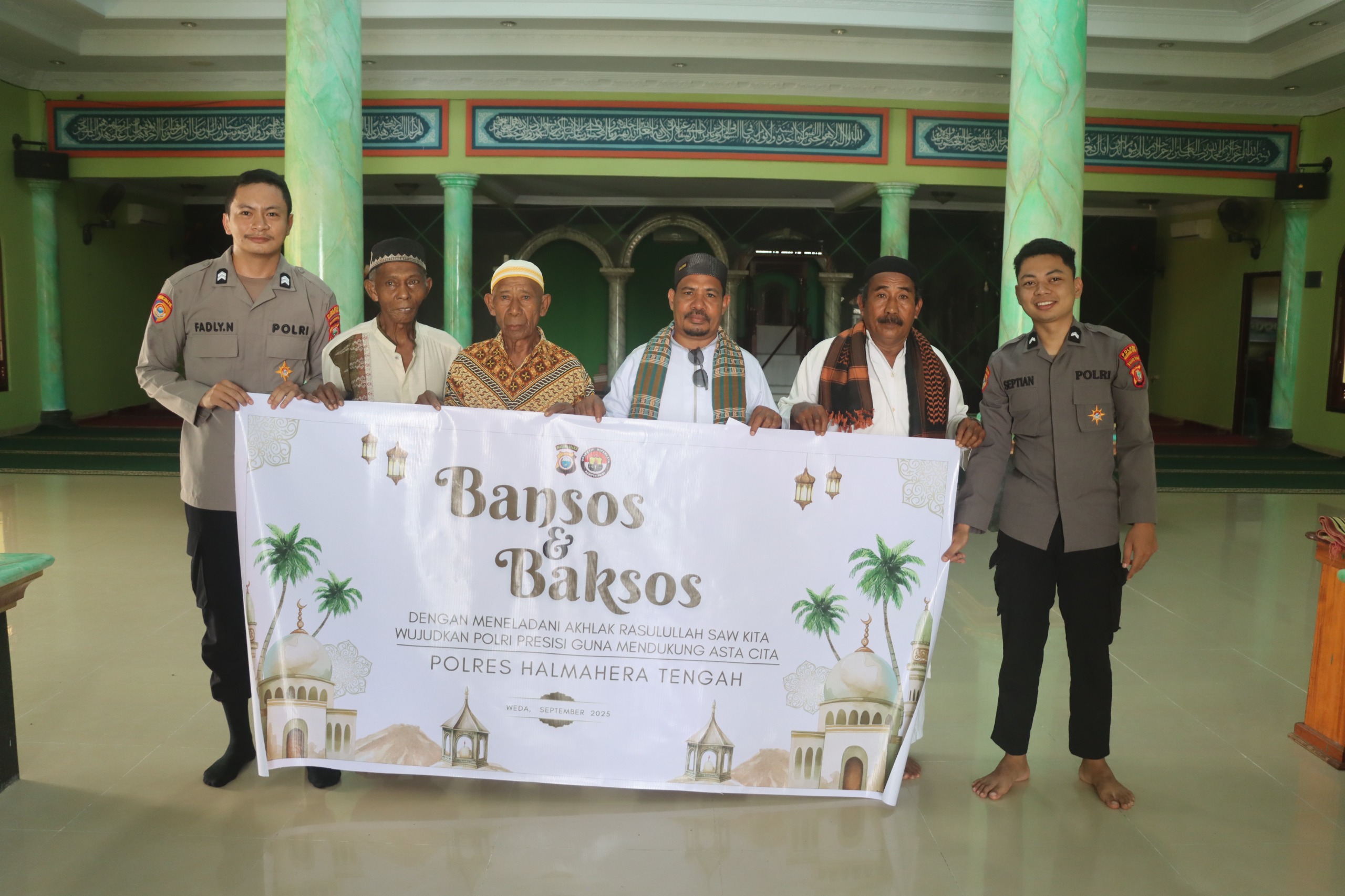 Weda-Dalam rangka memperingati Maulid Nabi Muhammad SAW 1447 H/2025 M, Polres Halteng menggelar bakti sosial (baksos) dan pemberian bantuan sosial (bansos) kepada pengurus mesjid (marbot) Baiturrahman, selasa (02/09/2025).