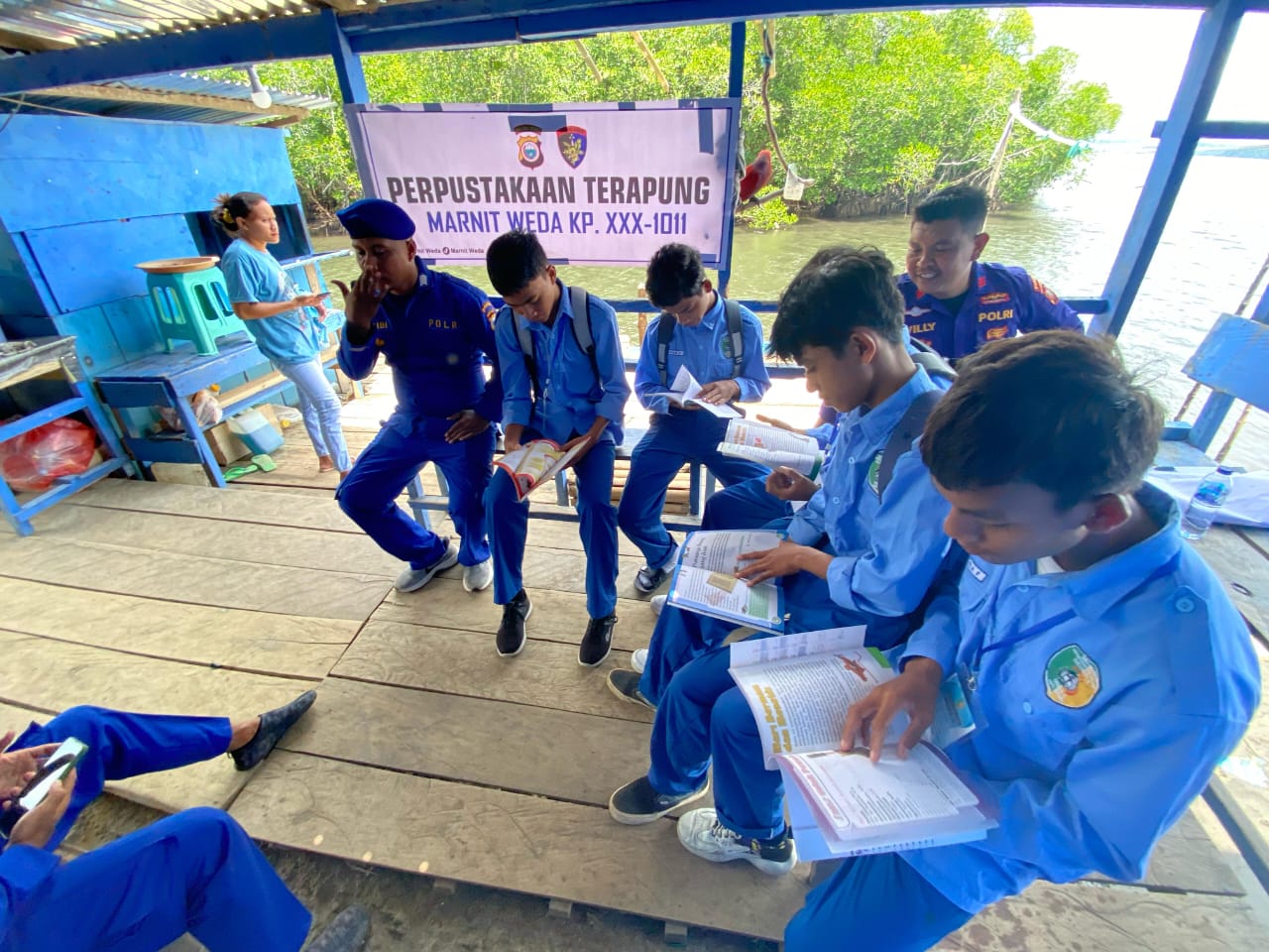 Humas polda Malut – Sat Polair markas Unit Weda KP.XXX-2005 Polda Malut terus memperkuat komitmennya dalam melayani masyarakat pesisir melalui serangkaian kegiatan sosial salah satunya Perpustakaan Terapung dengan cara Sambang siswa siswi pesisir.