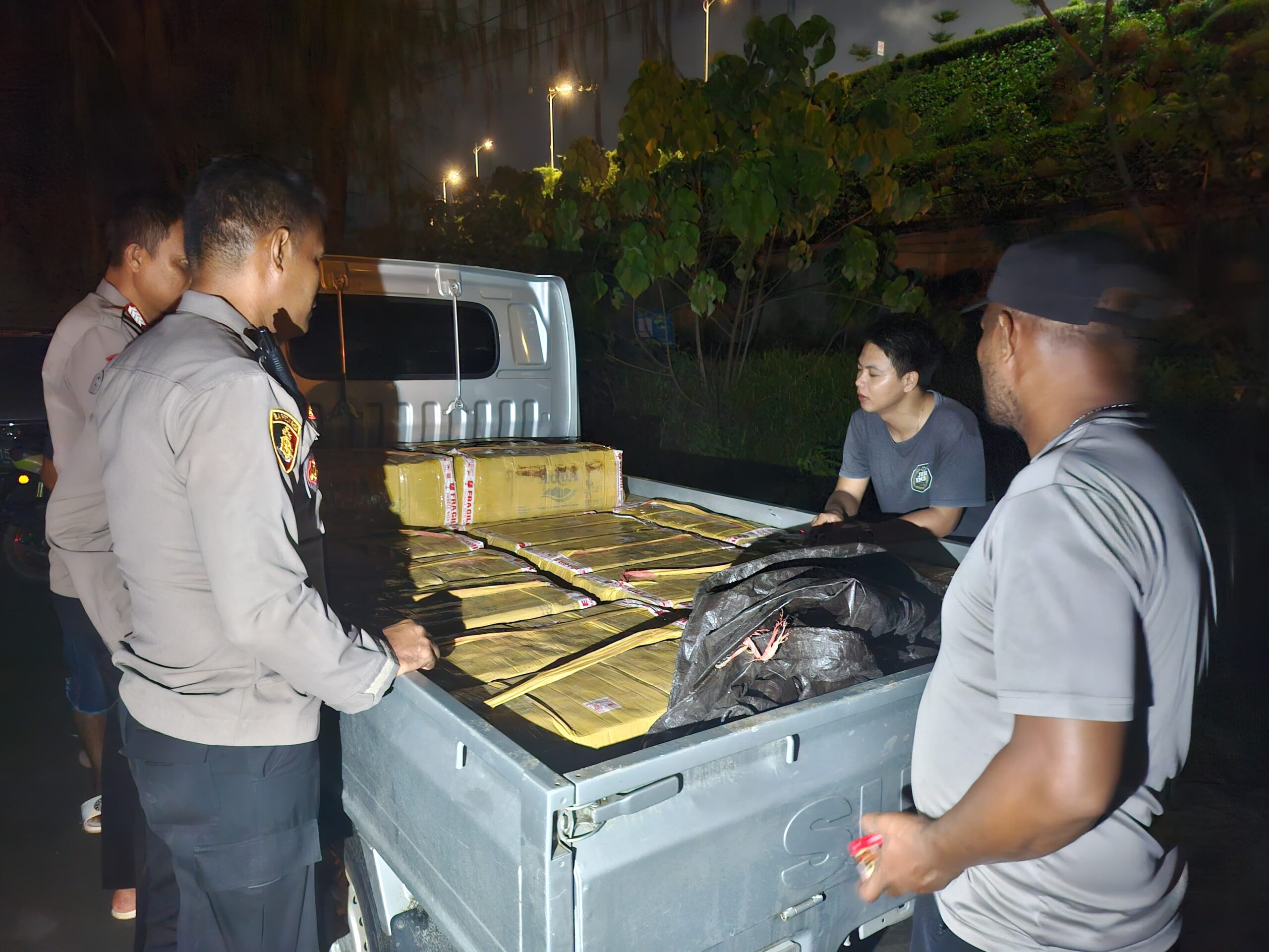 Barang Bukti Miras yang di amankan berjumlah 927 botol Miras yang di packing rapi kemudian di beri label fragile handle with care /jangan dibanting barang mudah pecah di dalam berisi 9 (sembilan) karton besar berisi 432 (empat ratus tiga puluh dua) botol,11 (sebelas) karton kecil berisi 495 (empat ratus sembilan puluh lima) botol, 1 (satu) unit Mobil Pick Up No.Pol DB 8269 LO Warna Abu-Abu Metalik.