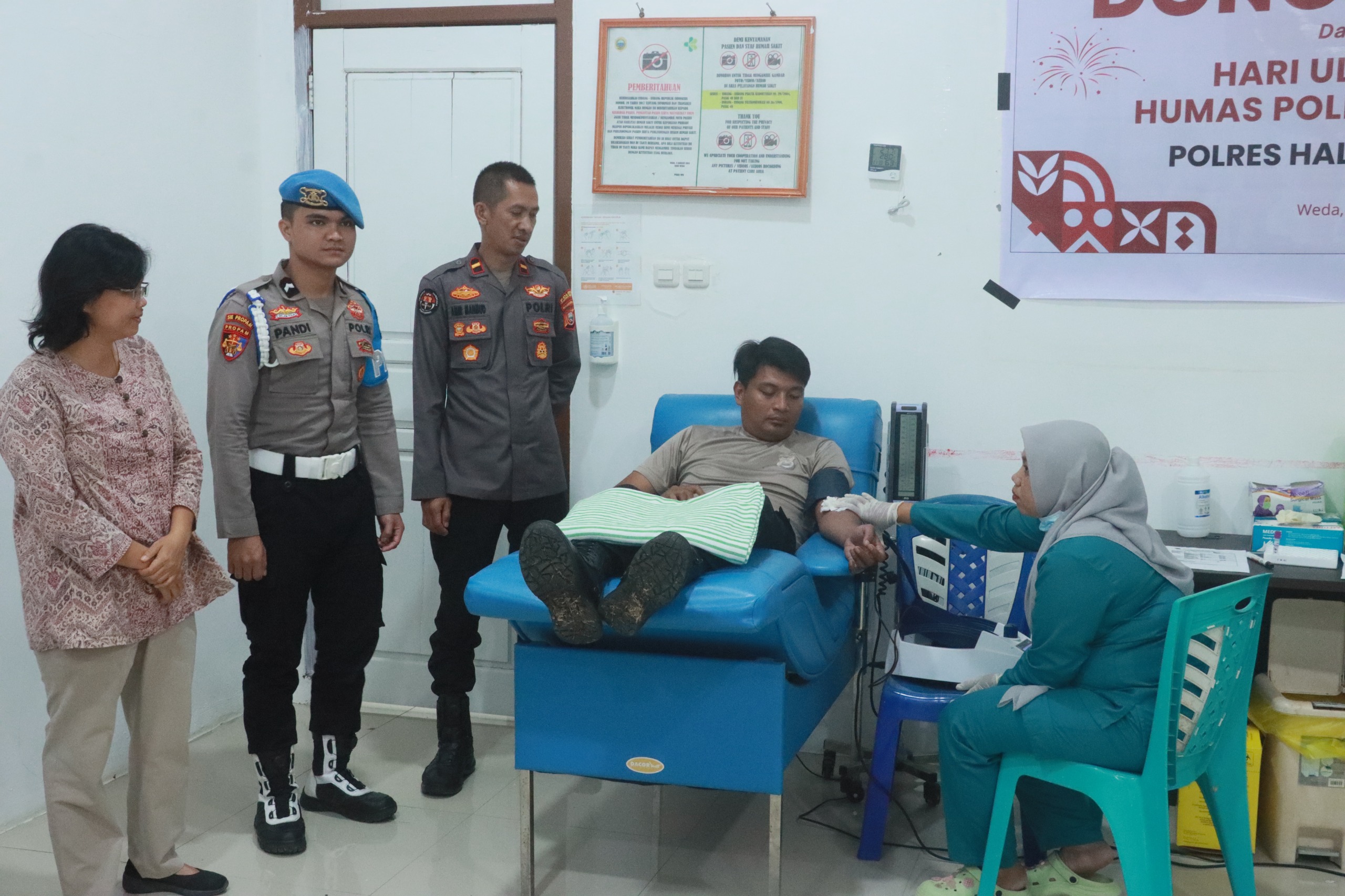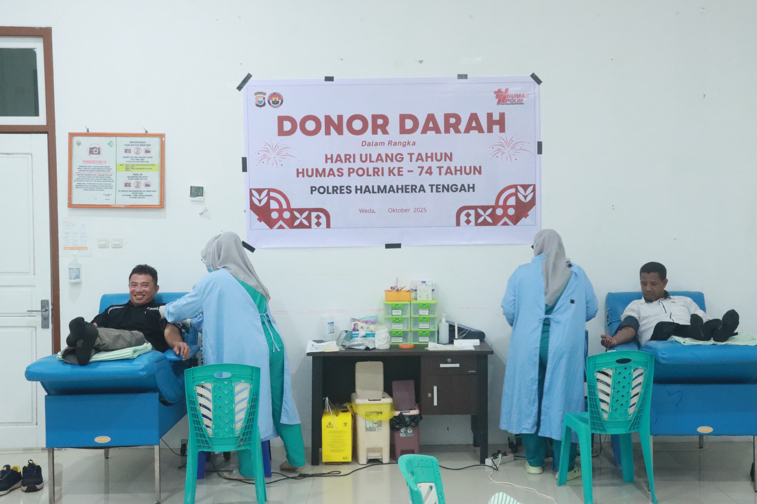 Weda, 22 Oktober 2025 — Dalam rangka memperingati Hari Ulang Tahun (HUT) Humas Polri ke-74, Polres Halmahera Tengah melaksanakan kegiatan bakti sosial donor darah yang berlangsung di RSUD Weda, Rabu (22/10/2025).