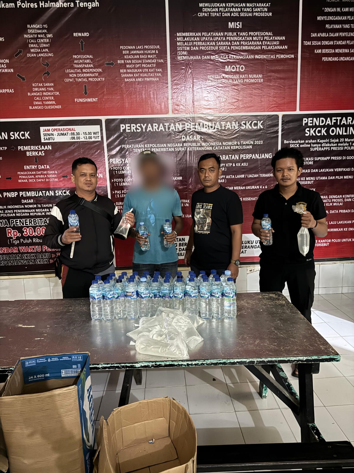 Halmahera Tengah – Jajaran Kepolisian Resor (Polres) Halmahera Tengah terus menggencarkan operasi pemberantasan minuman keras (miras) ilegal di wilayah hukumnya. Dalam serangkaian kegiatan yang dilaksanakan oleh beberapa satuan, petugas berhasil mengamankan puluhan liter miras tradisional jenis cap tikus dari tangan para penjual.