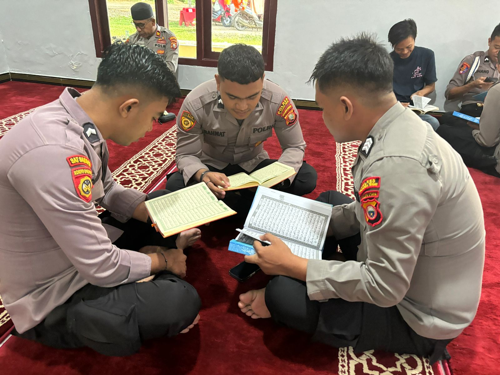 Sebagian anggota Polres Halteng menggunakan masa rehat selepas shalat dhuhur untuk bertadarus selama Ramadhan.