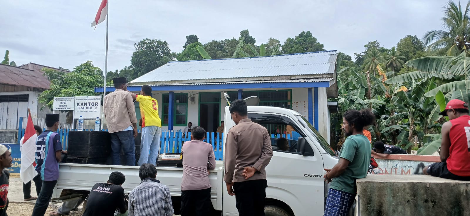 Personil Polsek Patani di pimpin oleh Kapolsek Patani Iptu Ikbal Barakti mengamankan jalannya aksi unjuk rasa di depan kantor Desa Bilifitu untuk mengantisipasi terjadinya hal-hal yang tidak diinginkan.
