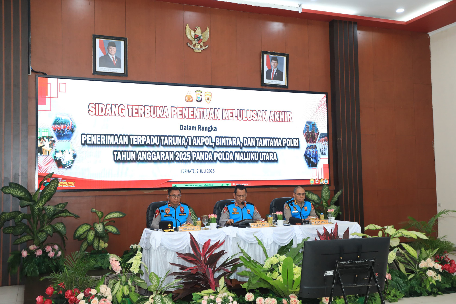 Kapolda Maluku Utara Irjen Pol. Drs. Waris Agono, M.Si., memimpin sidang terbuka penetapan kelulusan akhir seleksi penerimaan Akpol, Bintara dan Tamtama Polri Tahun Anggaran 2025 Panda Polda Malut, bertempat di Aula Kieraha Polda Malut, Rabu (2/7).