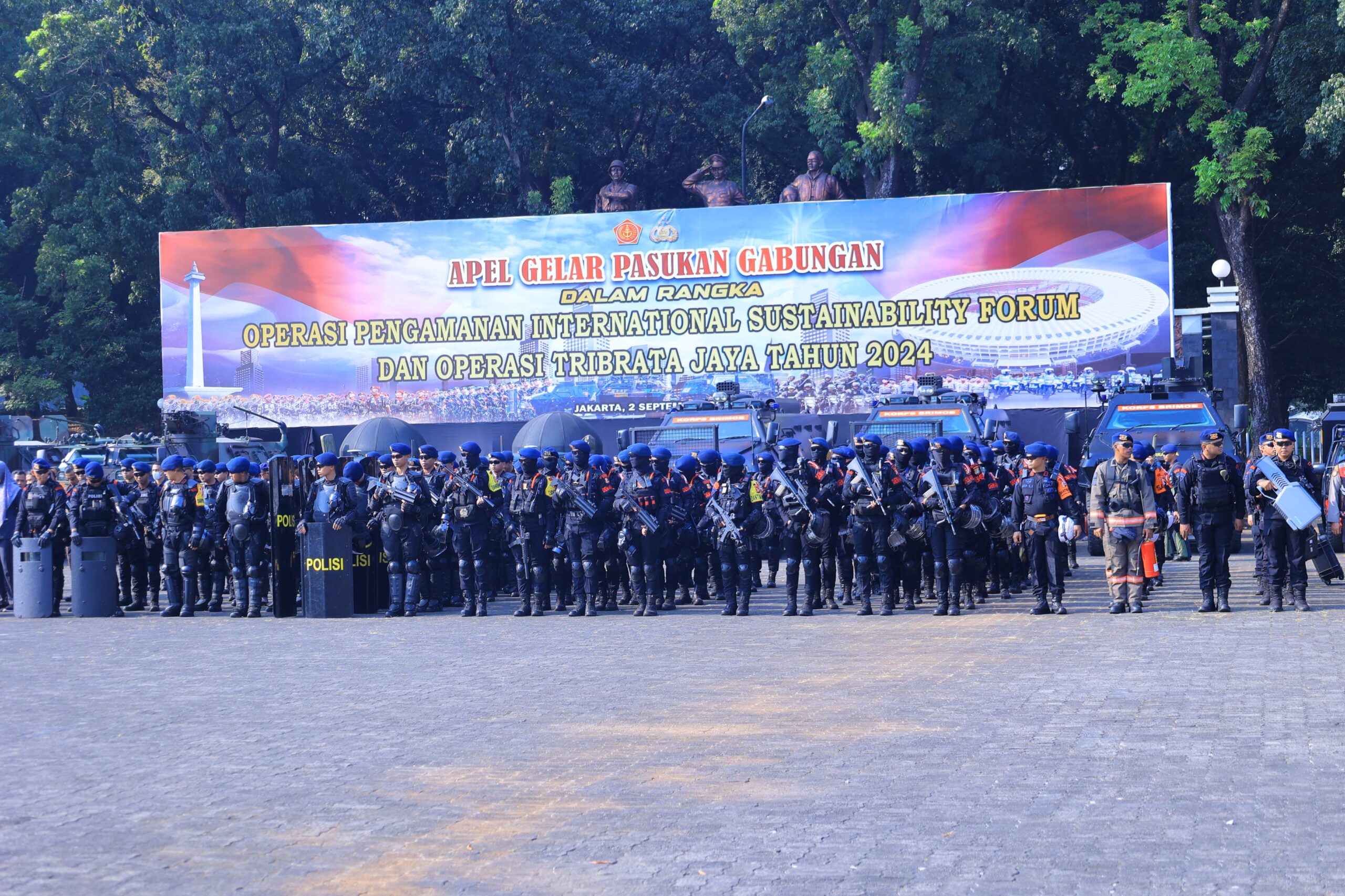 TNI-Polri menggelar apel gelar pasukan gabungan dalam rangka pengamanan kunjungan Paus Fransiskus dan kegiatan International Sustainability Forum (ISF) 2024 di Jakarta. Apel gelar pasukan ini dilakukan guna memastikan kesiapan personel dan alat kelengkapan pengamanan.