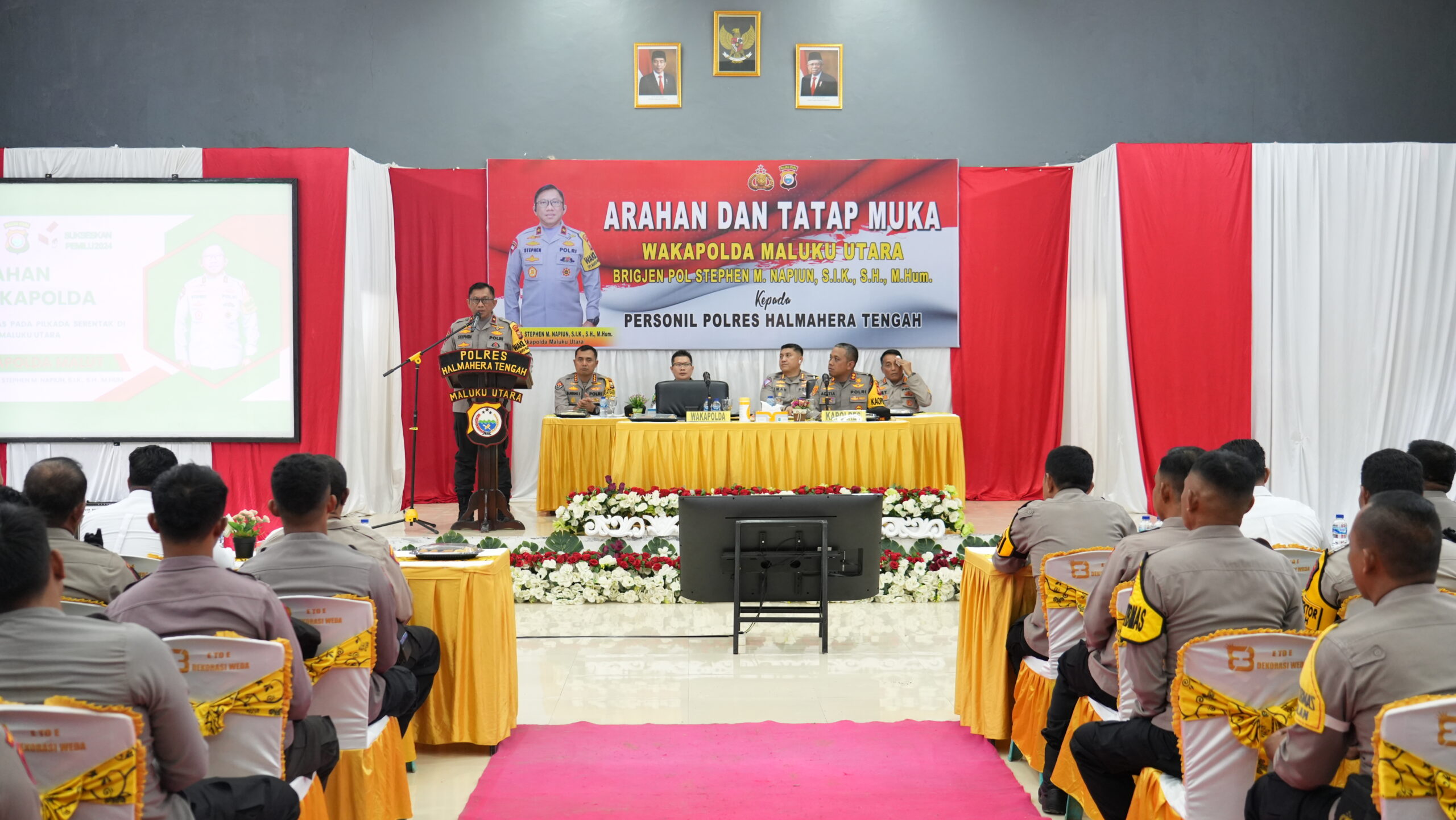Weda – Wakapolda Maluku Utara Brigjen Pol Stephen M. Napiun, S.I.K, S.H., M.Hum., melaksanakan kunjungan kerja dan memberikan arahan kepada personel Polres Halmahera Tengah Polda Malut di Aula Polres Halmahera Tengah. Senin (03/09/2024)